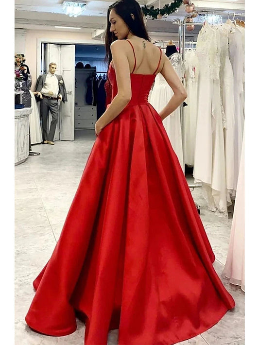 A-Line Prom Dresses Minimalist Dress Prom Court Train Sleeveless V Neck Pocket Satin with Ruffles