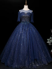Ball Gown Sparkle Elegant Quinceanera Prom Dress Illusion Neck Half Sleeve Floor Length Tulle