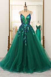 Dark Green A Line Tulle Long Prom Dress With Sparkly Sequined Appliques