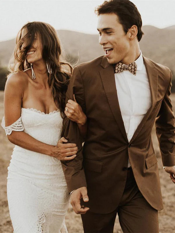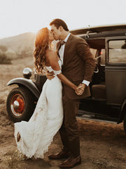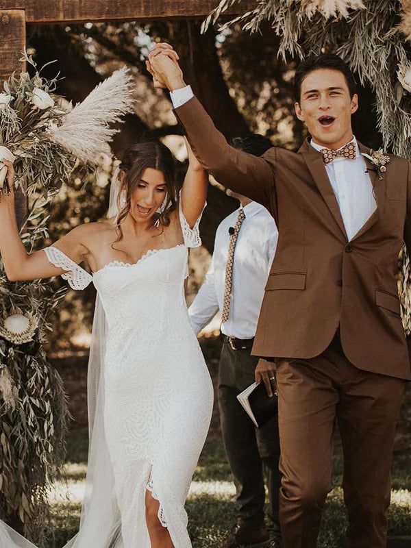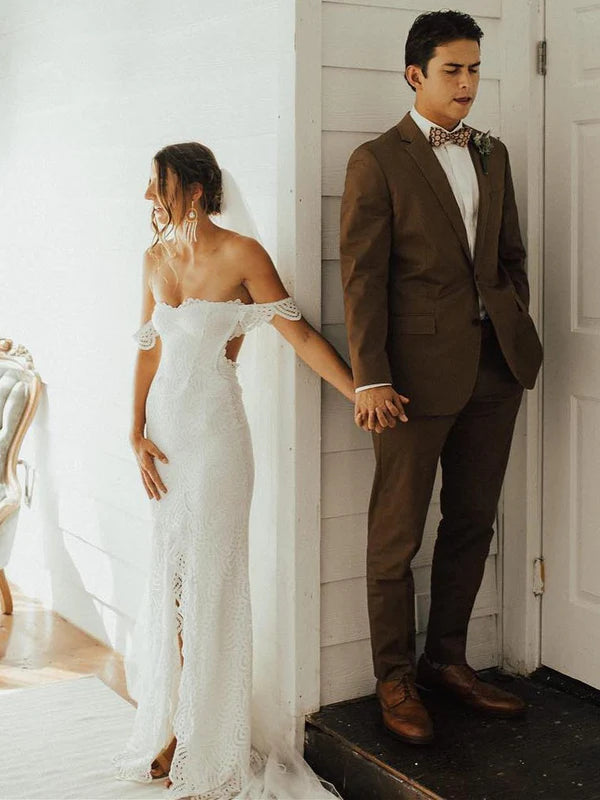 Attractive Off-the-shoulder Wedding Gowns Lace Sheath Bridal Dresses With Slit
