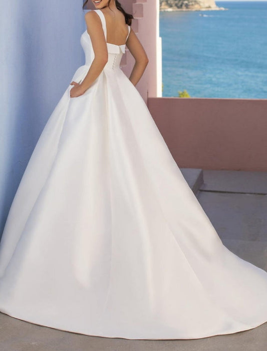 Hall Casual Wedding Dresses A-Line Square Neck Regular Straps Sweep / Brush Train Satin Bridal Gowns