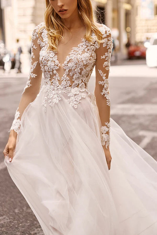 Regular price $145.99 USDRegular priceUnit price / per$225.99 USDSale price $145.99 USDSaleA-line illusion V-neck lace long sleeved Bohemian style slit wedding dress Beautiful