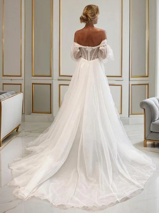 Regular price $141.99 USDRegular priceUnit price / per$221.99 USDSale price $141.99 USDSaleA-shaped Sweetheart Long sleeved Church Trailing Tulle Tight Corset Wedding Dress Off Shoulder With Slit