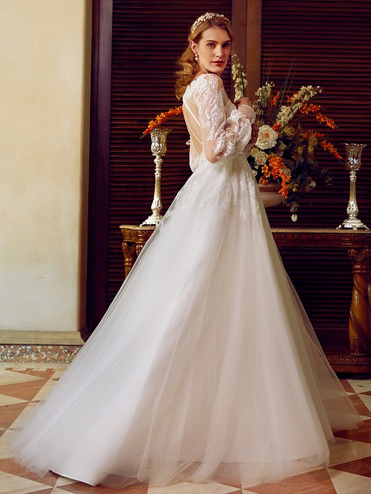 Regular price $169.99 USDRegular priceUnit price / per$249.99 USDSale price $169.99 USDSaleA-Line Wedding Dresses V Neck Lace Tulle Long Sleeve See-Through Pure Color