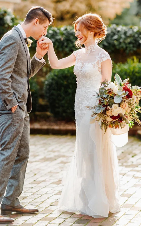 Sheath Ethereal Bell Sleeve Garden Wedding Dress Jewel High Neck Tulle Gown for Bridal Beautiful