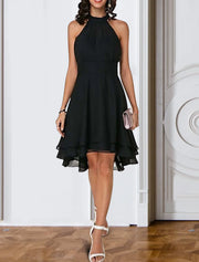 A-Line Cocktail Dresses Party Dress Wedding Guest Engagement Knee Length Sleeveless Halter Neck Chiffon V Back with Sleek Tiered