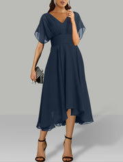 A-Line Wedding Guest Dresses Elegant Dress Holiday Fall Tea Length Short Sleeve V Neck Chiffon