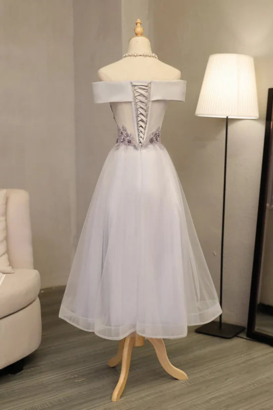 A Line Prom Dresses Boat Neck Tulle With Applique And Handmade Flowers Elegant Mother of the Bride Dress - US 2 / UK 6 / EU 32