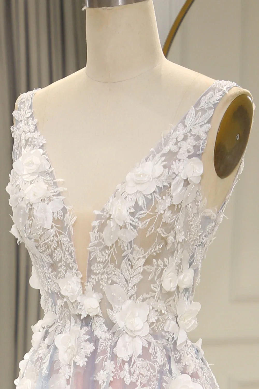 A-Line V-Neck Keyhole Back Long Tulle Prom Dress with Appliques With Flowers