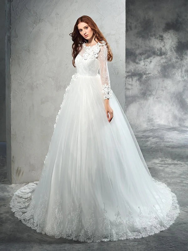 Ball Gown Sheer Neck Hand-Made Flower Long Sleeves Long Net Wedding Dresses With Flowers