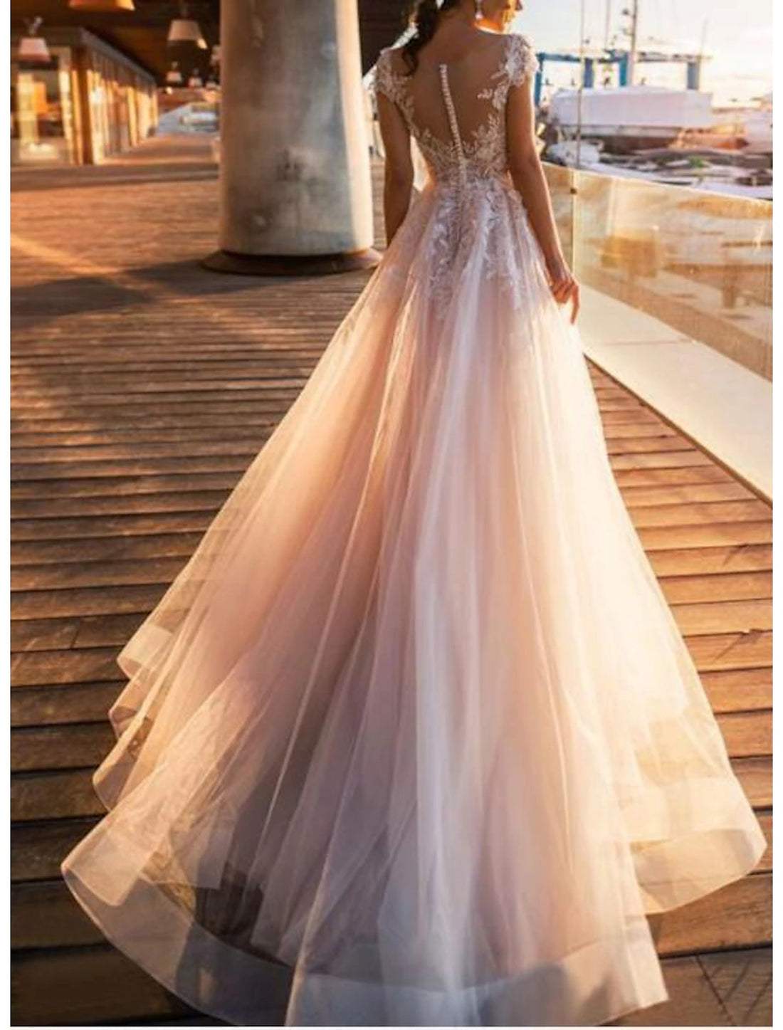 Beach Wedding Dresses A-Line Illusion Neck Cap Sleeve Floor Length Lace Bridal Gowns With Pleats Ivory