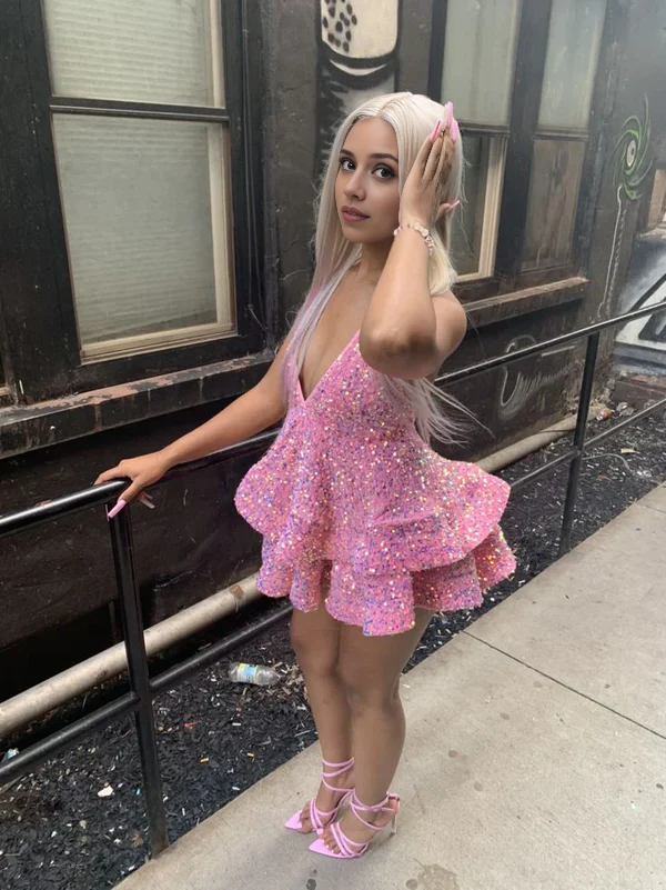 Fashion A Line V-Neck Halter Open Back Short Prom Dress Lovely Sequins Homecoming Dress Charming Birthday Party Dress