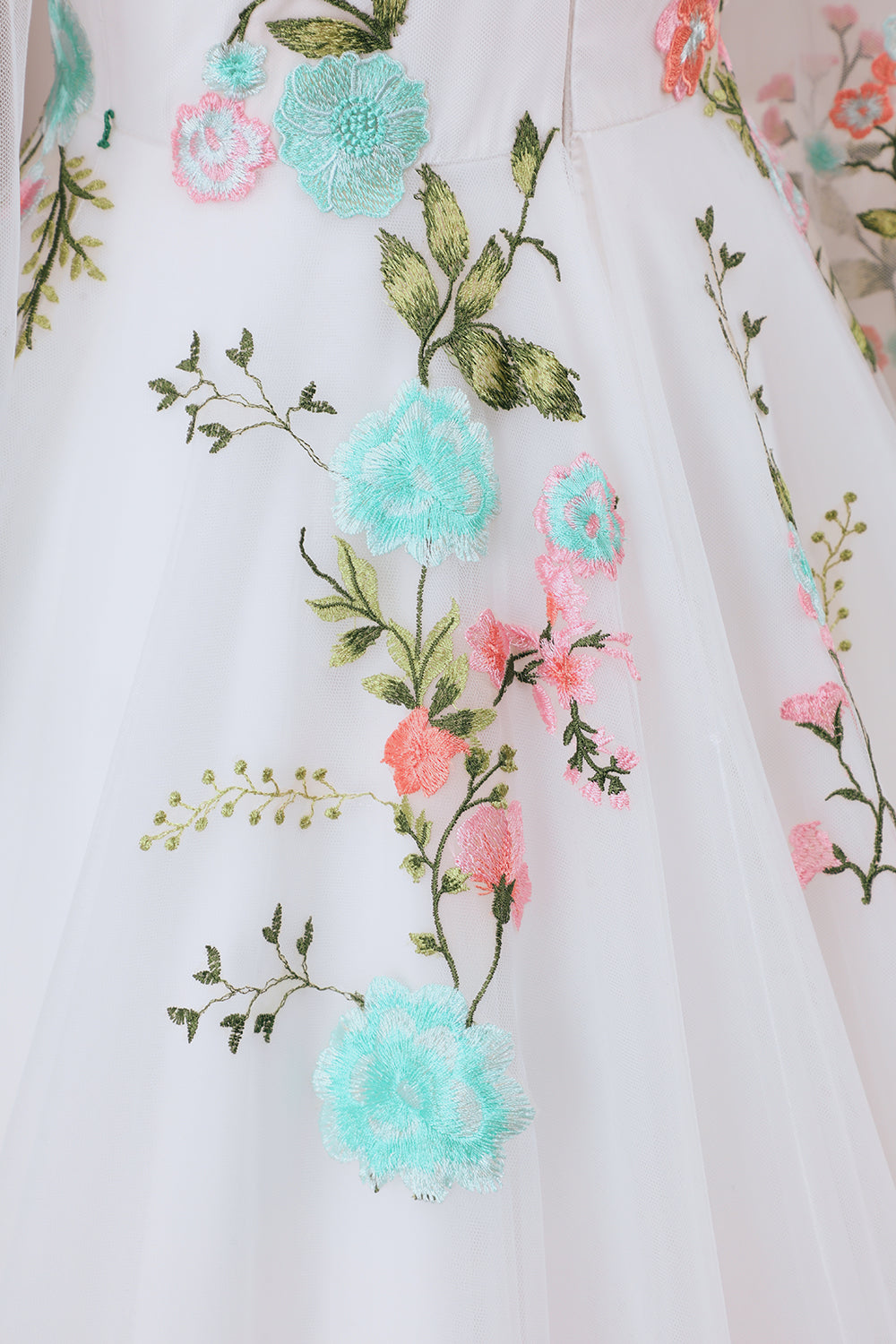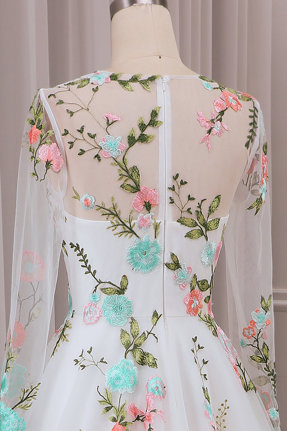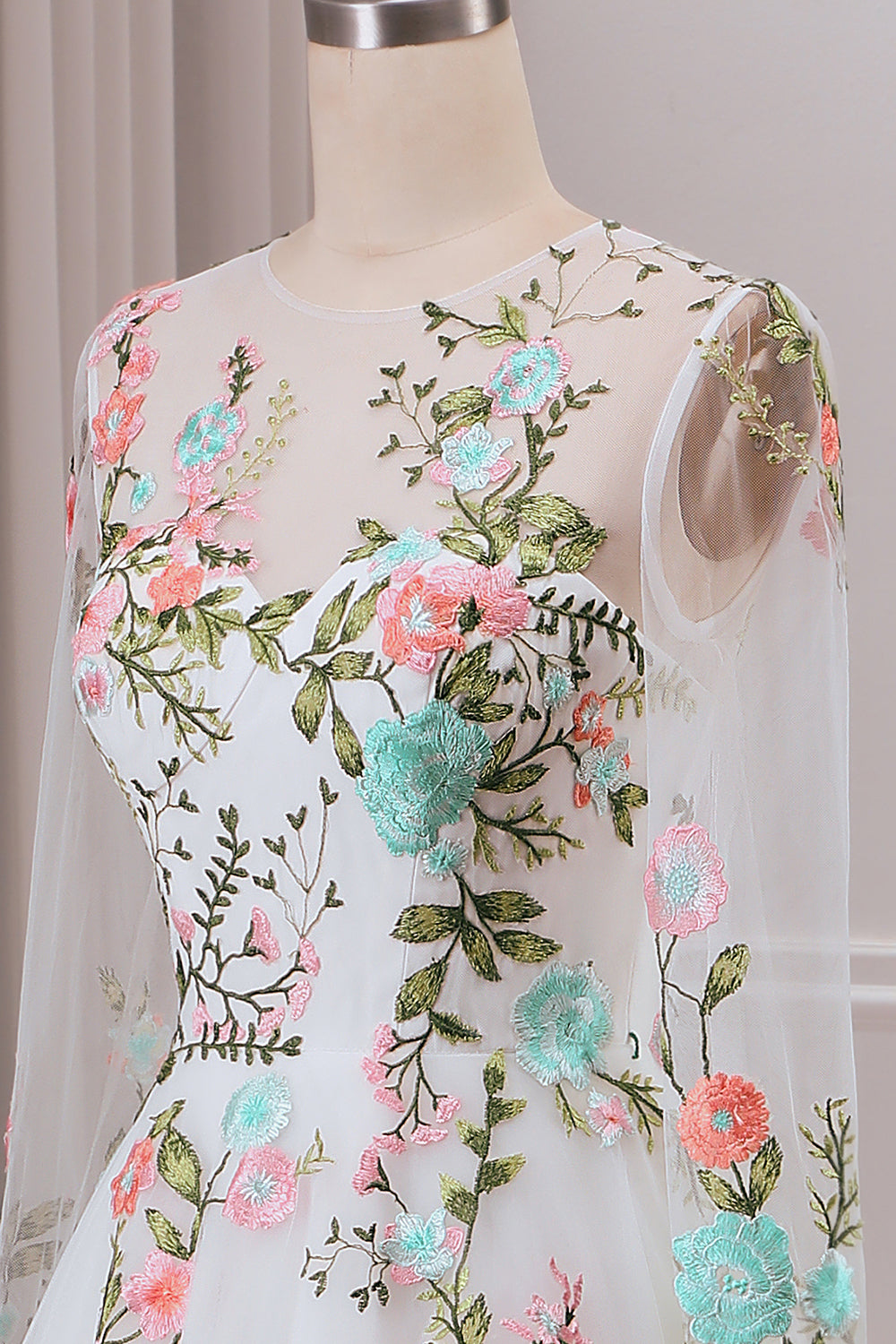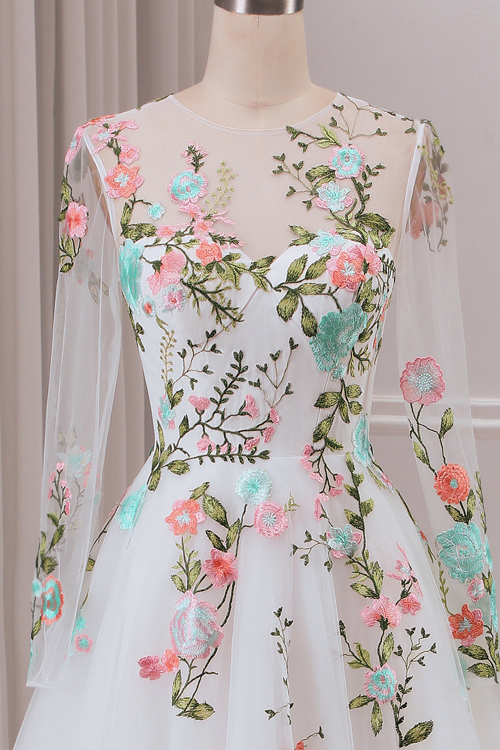 Ivory Flower A-Line Round Neck Tulle Wedding Dress with Long Sleeves Beautiful