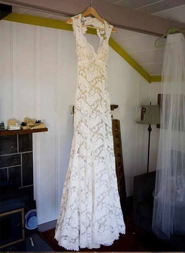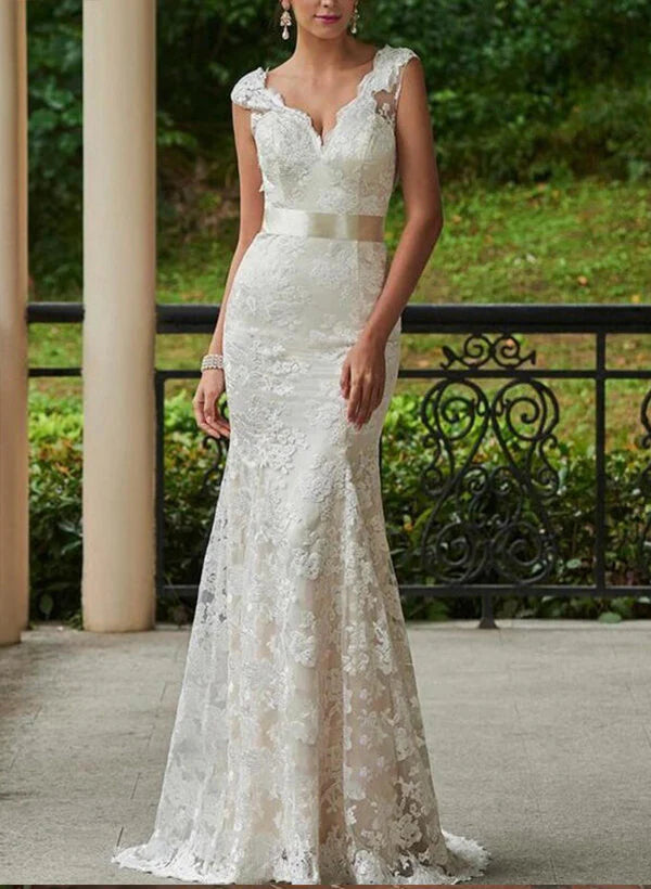 Lace Sheath/Column V-Neck Wedding Dresses With Bow(S) Sweep Train Sleeveless Elegant