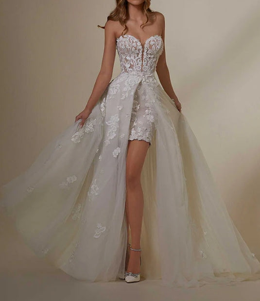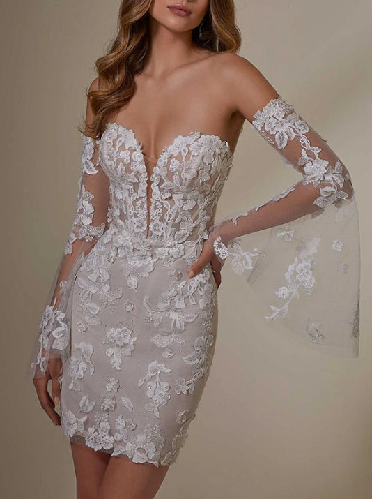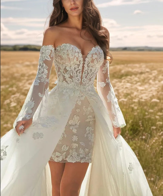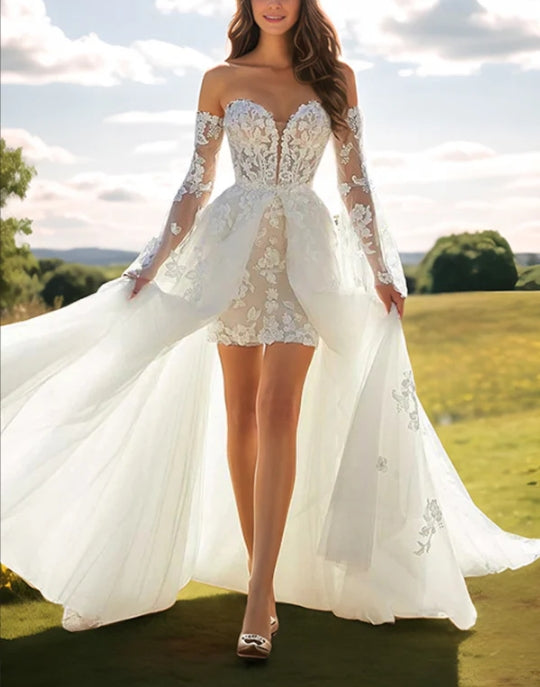 Sweetheart Long Sleeves Lace Wedding Dresses With Detachable Train Off Shoulder Beautiful