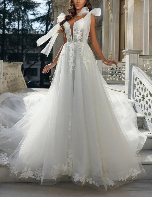 White Wedding Dress A Line Appliques Bridal Dress With Lace Appliques Sleeveless Floor Length